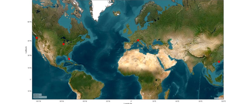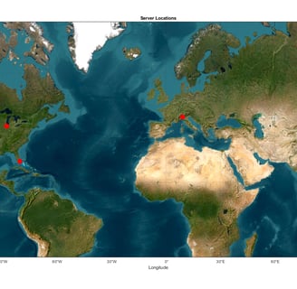 This diagram shows the computer locations of where we have tested "random" numbers. These experiments tell us that these numbers are not in fact random.